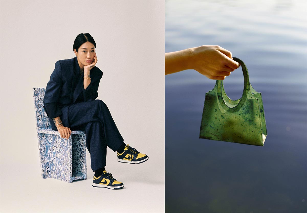Among the exhibits are sustainable footwear made from used tyres by Indonesian brand Indosole; playful table tennis bats crafted from recycled plastic by Sydney studio Préssec; a pair of guardian lions grown into shape using mycelium (a natural fungi material of industrial strength) by Mycotech Lab; ceramic vessels glazed with coloured pigments derived from metal mining residue by Lithuanian designer Agne Kucerenkaite; homeware made from renovation and construction waste by homegrown label LAAT; and one-of-a-kind refurbished chairs by beloved local second hand furniture store Hock Siong in collaboration with textile studio Soft Studio.