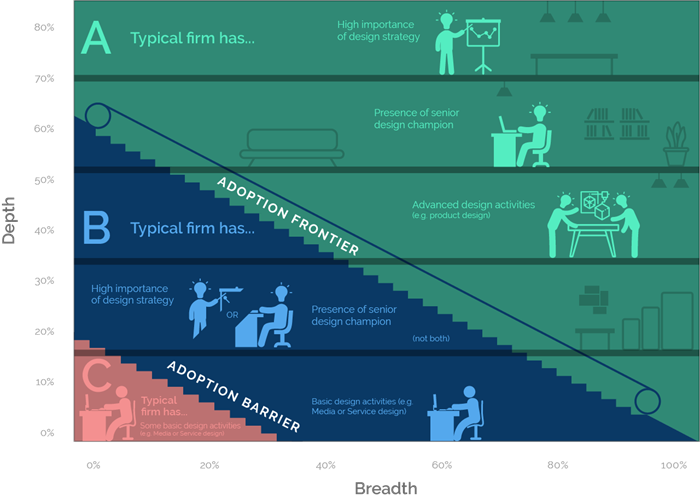 To understand the impact of design, we used the baseline data captured in 2014 to map the businesses we interviewed across the design adoption matrix – which comprises the depth and breadth indices – and we segmented the businesses in the three clusters formed based on the characteristics of their design adoption.