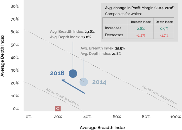 After mapping the businesses across the matrix, we observe that businesses have reduced the breadth (scope) and increased the depth (intensity) of their design adoption from 2014 to 2016. However, increase in both Breadth Index, and Depth Index (measured with regards to 2014 baseline) were associated with higher profits.