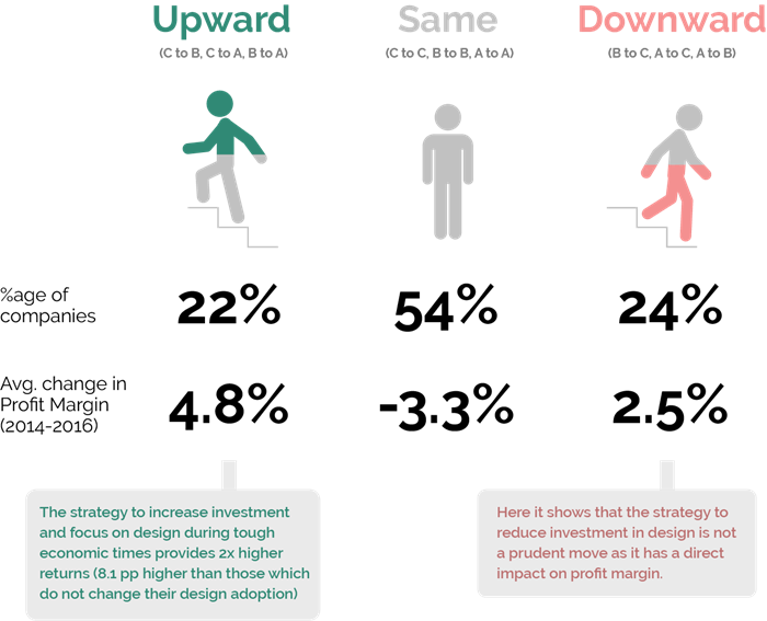 The study showed that continued adoption of design could provide higher returns – companies which continued to adopt design also saw better returns (in terms of profits) as compared to firms which remained stagnant or reduced their design adoption. However, a limitation of the study is that overall business performance cannot be just attributed to the use of design. In addition, we noted that: