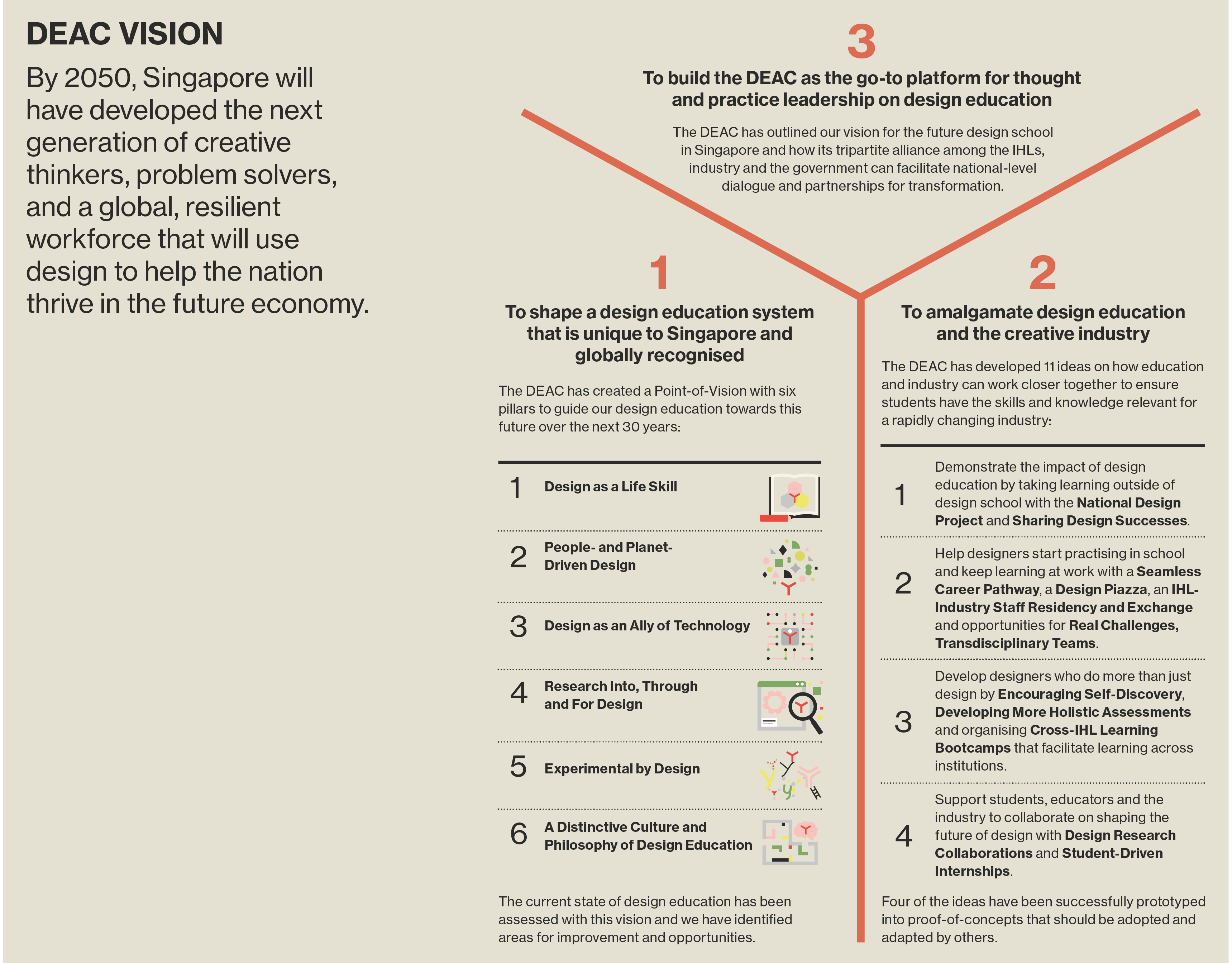 The DEAC envisions that by Year 2050, Singapore would have developed the next generation of creative thinkers, problem solvers, and a global, resilient workforce that will use design to help the nation thrive in the future economy. The following are three recommendations to realise this vision: