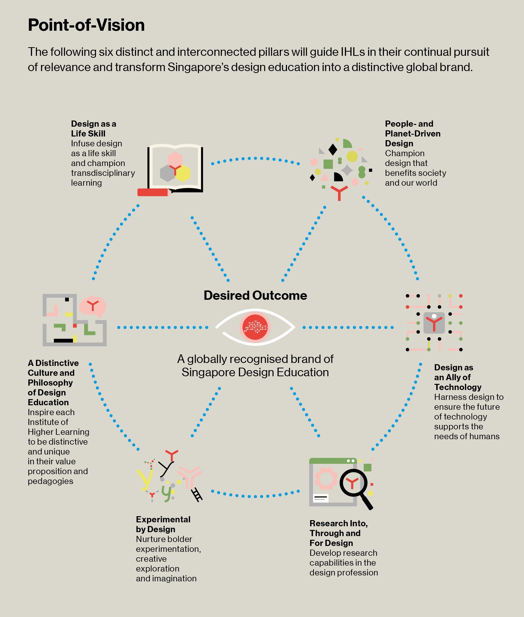 The Point-of-Vision consists of six distinct yet interconnected pillars to transform design education in Singapore. Each pillar develops a set of capability drivers and content directions deemed essential by the DEAC for shaping the future workforce. The significance of each pillar has been thoroughly discussed, along with potential actions for their implementation. The IHLs have also reviewed against each pillar to assess the gaps and opportunities.