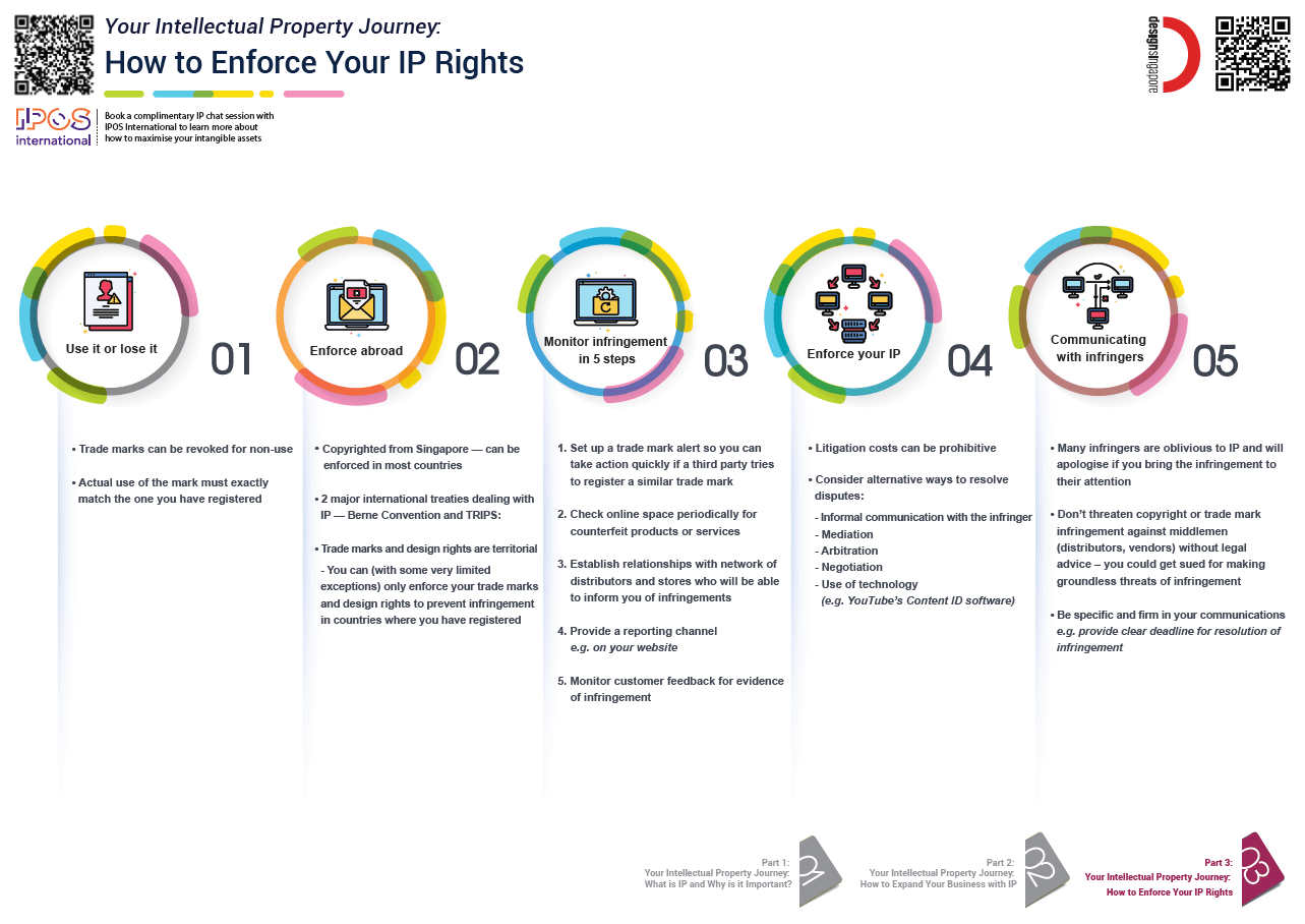 As producers of original and creative works, design firms need to have strong foundational intellectual property (IP) knowledge in order to better protect their IP rights. To support you in your IP journey, the DesignSingapore Council has put together a three-part infographic series that will take you through the IP process step by step, and develop your capabilities and skillsets. Here’s part 3.