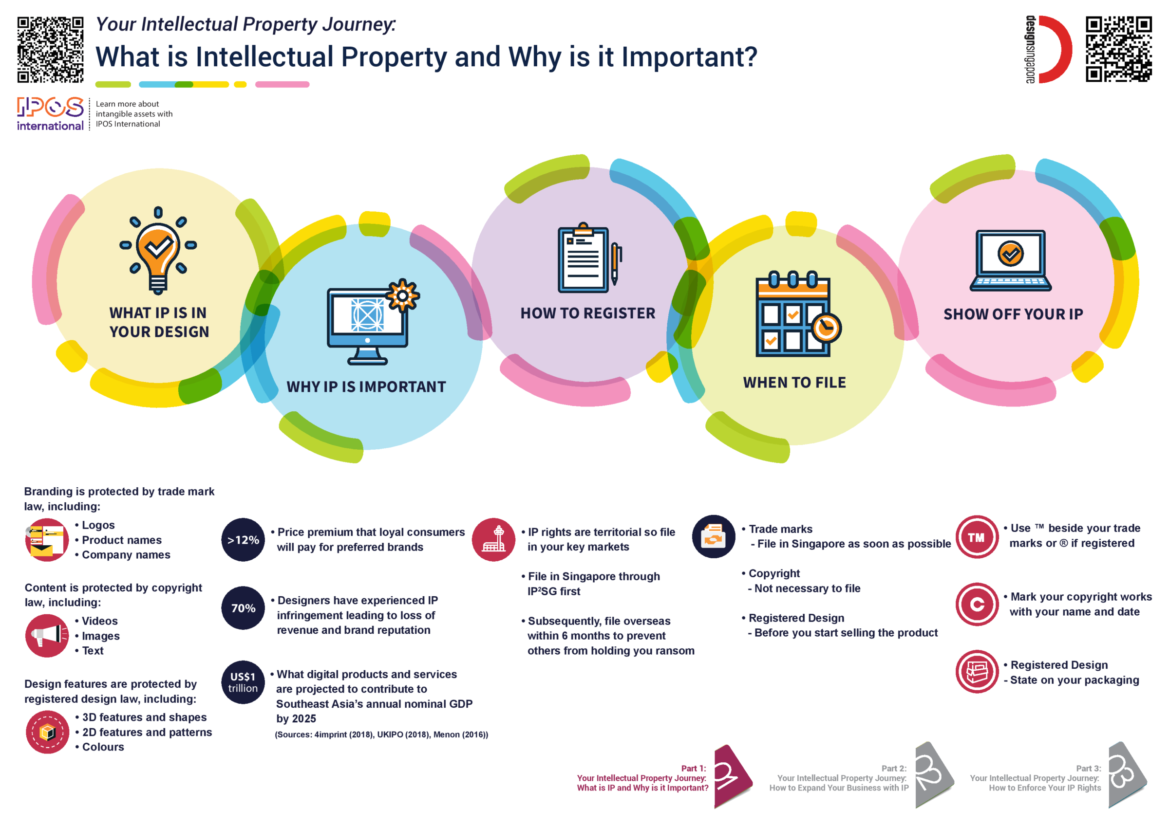 As producers of original and creative works, design firms need to have strong foundational intellectual property (IP) knowledge in order to better protect their IP rights. To support you in your IP journey, the DesignSingapore Council has put together a three-part infographic series that will take you through the IP process step by step, and develop your capabilities and skillsets. Here’s part 1.
