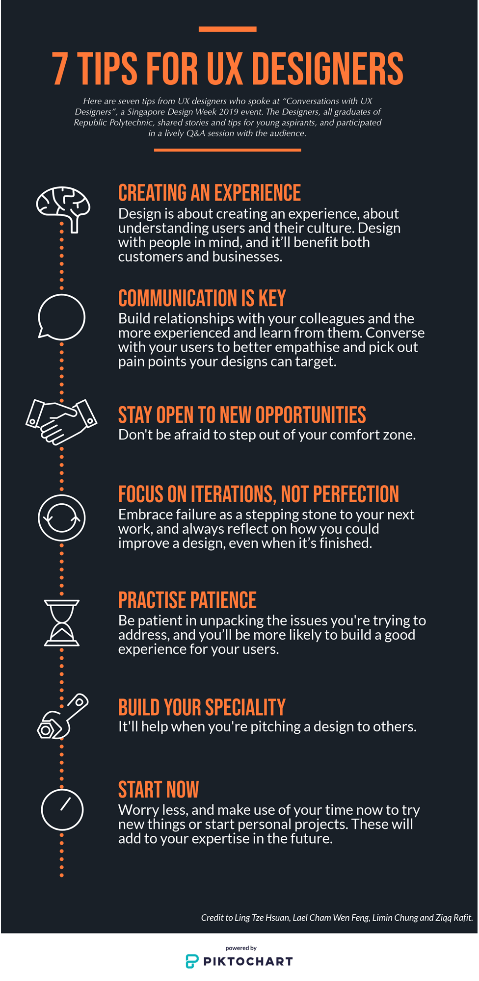 Here are seven tips from UX designers who spoke at “Conversations with UX Designers.”, a Singapore Design Week 2019 event. The designers, all graduates of Republic Polytechnic, shared stories and tips for young aspirants, and participated in a lively Q&A session with the audience.