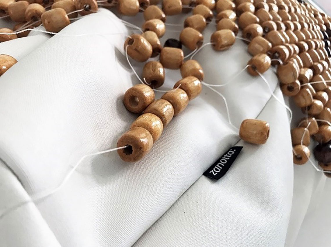 Jarrod and his team went to their contacts in Indonesia to help look for the beads or make them, but even after a month of searching, they couldn’t find anything suitable. Finally, they decided to look for the wooden bead seat covers in Mustafa Centre, and that’s where they found them. They took the seat covers apart, and re-threaded them into the cover for the Sacco bean bag chair.