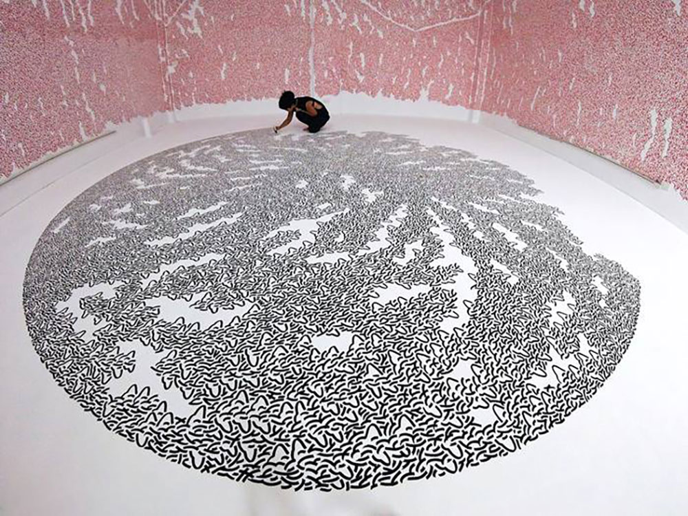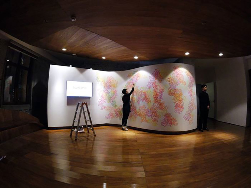 Juliana has grown her practice and worked with large brand names such as Swatch, Zouk, PayPal, and Vans, as a resident and associate artist. She was given full control of creative expression in all her commissioned works. Feeling grateful for this freedom, Juliana always strives to outdo what she’s done before. She cites this as her greatest challenge, constantly trying to improve and build upon what she had previously created. The joy of the designer comes from the process of mark making, the piece slowly unfolding into something new and unexpected. It is constantly discovering new ways in which a piece can fall into place, which keeps Juliana fascinated and interested in her work.