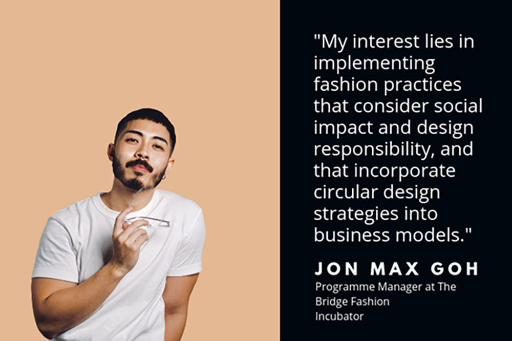 In 2011, Jon Max Goh won a DesignSingapore scholarship to study Fashion Design at Parsons School of Design in New York. He graduated in 2015, as the school’s Menswear Designer of the Year, and worked abroad for 7 years before returning to Singapore. Today, he’s a programme manager at The Bridge Fashion Incubator – the first fashion and fashion-tech incubation programme in Southeast Asia that focuses on fashion, tech and sustainability. The 30-week programme is an initiative by the Singapore Textile and Fashion Federation(TaFF) and supported by Enterprise Singapore.