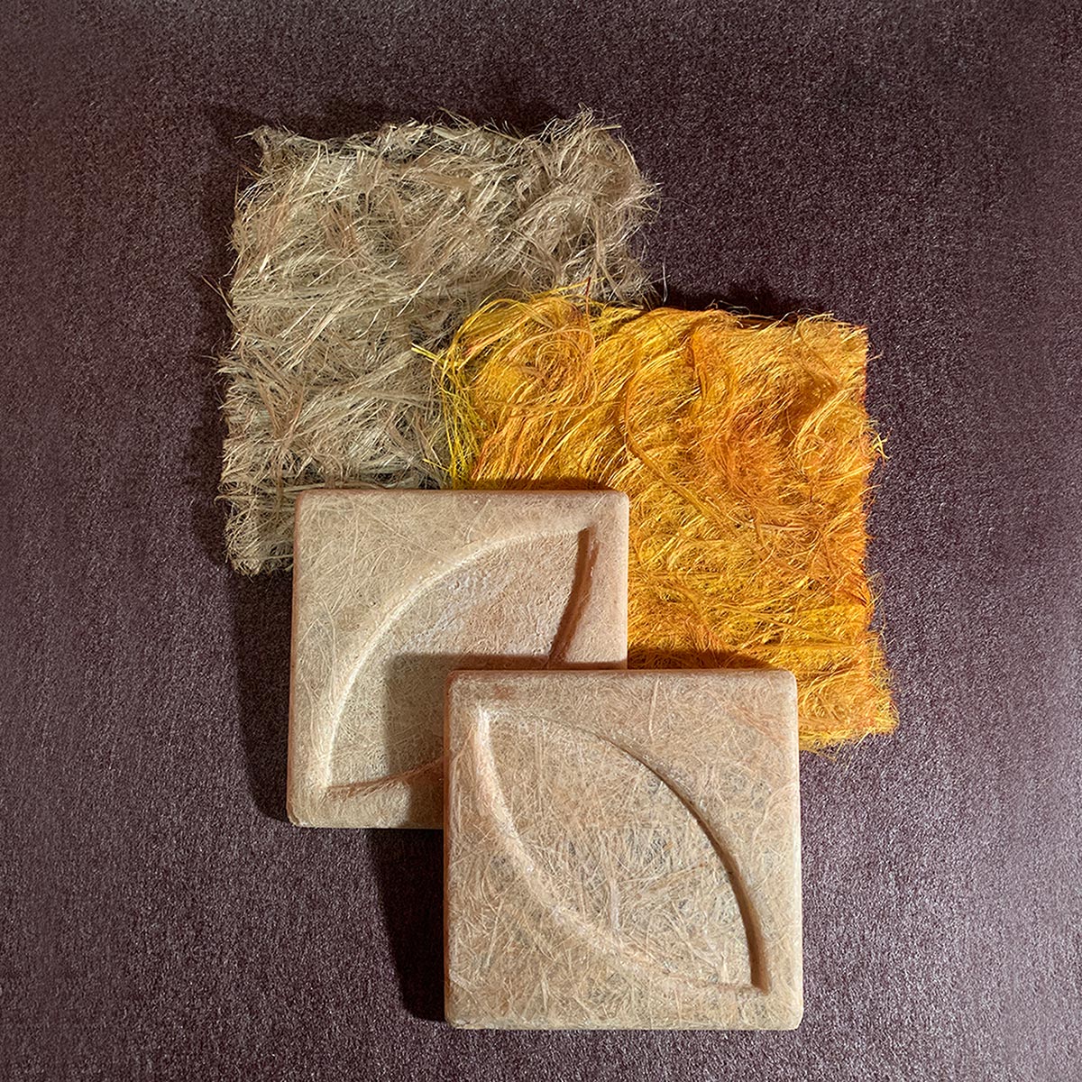 We started by prototyping tiles for the interior and worked our way towards the exterior. The end goal is to create a prototype shelter as a proof-of-concept. Building on Tim’s knowledge, we have been experimenting with various moulds and techniques to create different kenaf tile designs. Along the way, we also introduced organic dyes such as turmeric, beetroot and even blue pea extracts to test if they would penetrate and permanently alter the natural colour of the fibres.