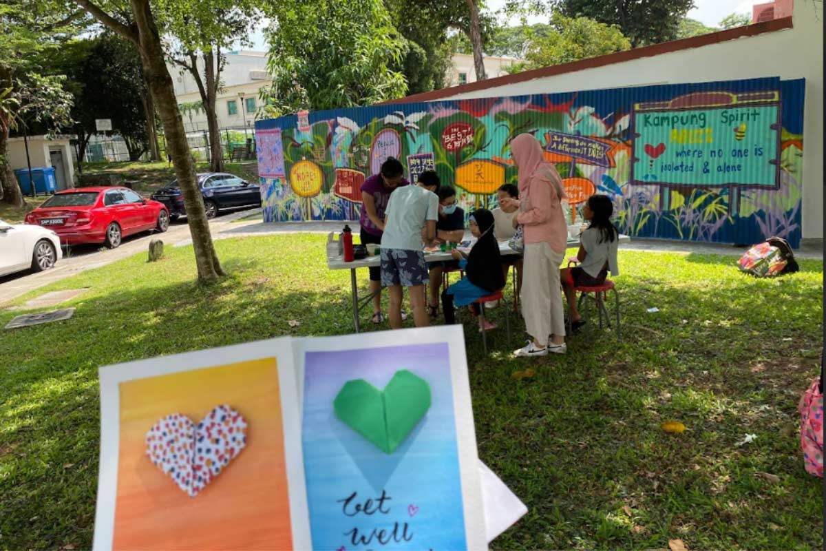 Queenstown Kakis launched its first public event in April 2022 to introduce itself to the neighbourhood. They were scratching their heads on how to do so when the nine-year-old in their group, Eva Nabila, suggested they just say hello and make friends. It just so happened that Kwee was renovating her new house at Block 46, and it had a construction hoarding facing an empty grass patch. The group decided to invite residents to create a welcome mural on it and from then on, started holding fortnightly gatherings in front of it.