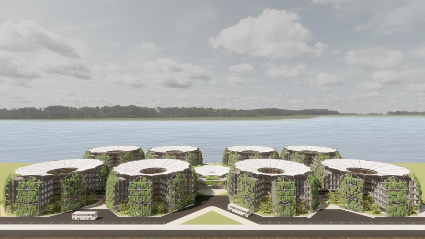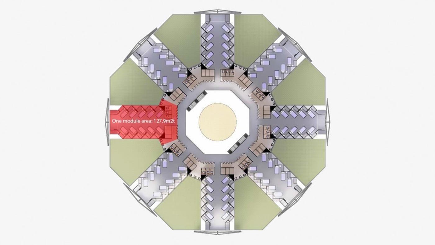 Conceptualised as a tropical vernacular, the proposed structure considers large overhangs, a porous layout with functional façade design. The octagonal shape of the building is intentional, made up of eight rectangular forms that are also the arrangements of the rooms. The modular form of the built aims for a fuss-free approach in production or replication, fitted for the mass population in a dormitory. With the use of pre-fabricated technology and low-density design, the concept proposes a new archetypal layout that can be easily modelled and is economically sound.