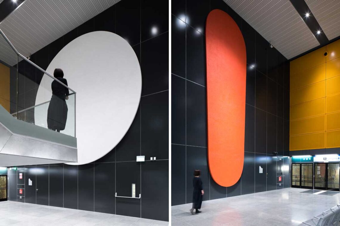 One of them, a seven-metre-diameter white disc, hangs brilliantly on a dark wall at one end of the station, revealing itself in full as you make your way up or down an adjacent staircase between the ticketing concourse and the train platform. The other, an enormous nine-metre-long rounded orange stroke, makes its mark on the opposite wall, revealing its full length as you ascend or descend in the lift.