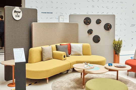 Try out the set of furniture on display at the Play at Work installation. Featuring privacy panels with a dartboard screen, a coffee table with a roulette whiteboard, and a sofa set with a charging port, the furniture set was put together by designers from Benel and 11H, and designed to transform the homogenous look typical of most offices.