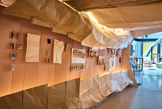 At the Take a Peak exhibit, you can walk through a tunnel-like space adorned with crumpled and creased paper. Here, you can take a closer look at how the textural quality of paper is made more dynamic with the depths and tones created by the crushing process. With the objective of exploring the architectural possibilities of paper, this exhibit is a collaboration between Antalis, a paper distributor, and META Studio, a design practice.